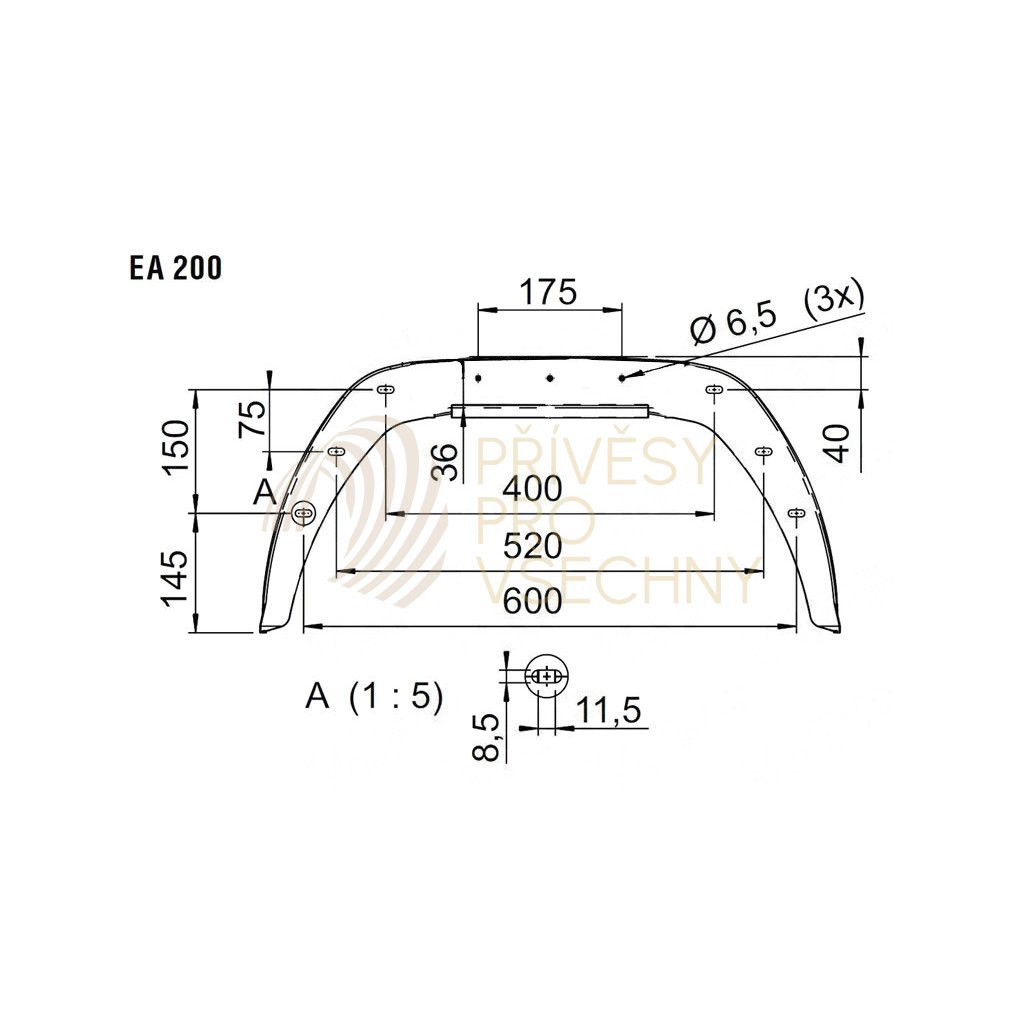 - Boční strana blatníku je opatřena oválnými otvory 8,5 x 11,5 mm pro snadnou montáž blatníku k bočnici přívěsu