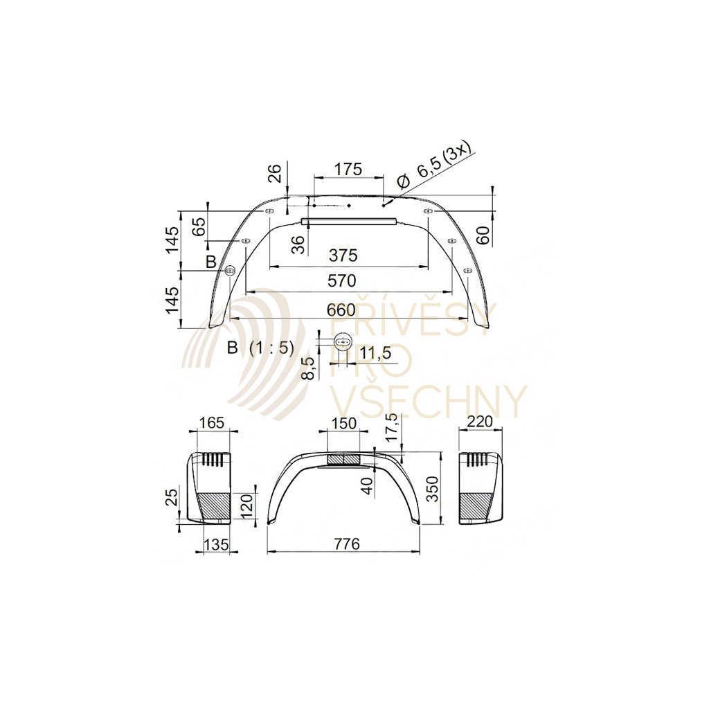 - Boční strana blatníku je opatřena oválnými otvory 8,5 x 11,5 mm pro snadnou montáž blatníku k bočnici přívěsu