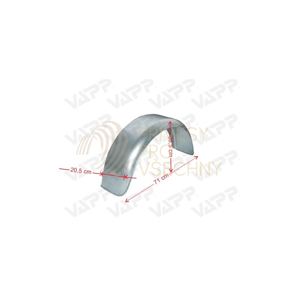 Celoplechový oblý pozinkovaný blatník šíře 200 mm (vnější)/195 mm (vnitřní), vhodný pro 12 a 13 palcová kola. Jedná se o 2. jakost produktu: blatníky mohou mít zohýbané lemy v míře, která nebrání běžnému užívání, ale snižuje celkový estetický dojem z blatníků.