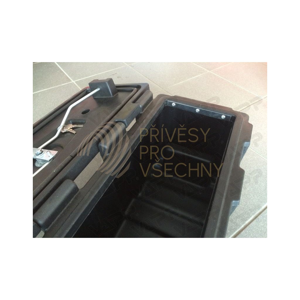 Uzamykatelný plastový box na na nářadí, upínací soupravy a pod. Odklápěcí víko je vybaveno otočným uzamykatelným madlem s plastovým krytem zámku, přiloženy jsou dva klíče.