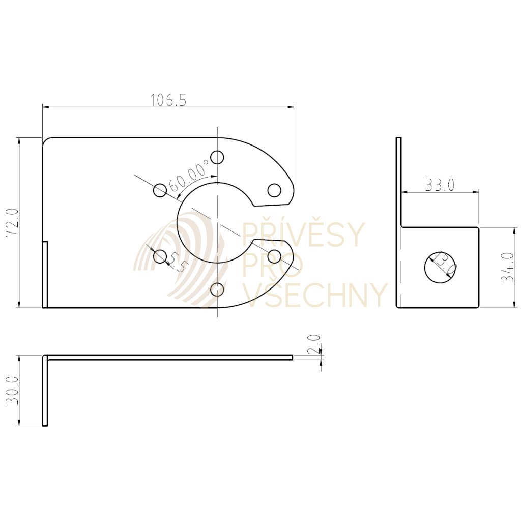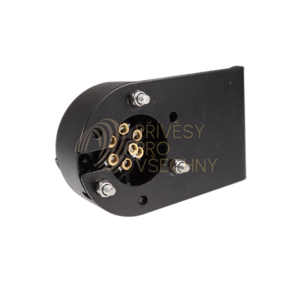 Univerzální kovový držák pro zásuvky 12V. Pro uchycení zásuvky je dřžák opatřen šesti otvory pro šrouby M5. Jejich rozmístění odpovídá montážním otvorům standardních 12V zásuvek 7-pólových a 13-pólových. Na vozidlo je pak možné držák připevnit šroubem M12. Montovanou zásuvku je nutné opatřit gumovou těsnící podložkou odpovídající tvaru zásuvky, aby bylo dosaženo optimálního zabezpečení před vnikáním vody. Montážní materiál ani zásuvka nejsou součástí balení.