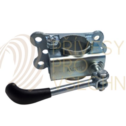 Plechový držák opěrného kolečka se sklopnou kličkou. Pro opěrná kolečka s průměrem trubky 48 mm.