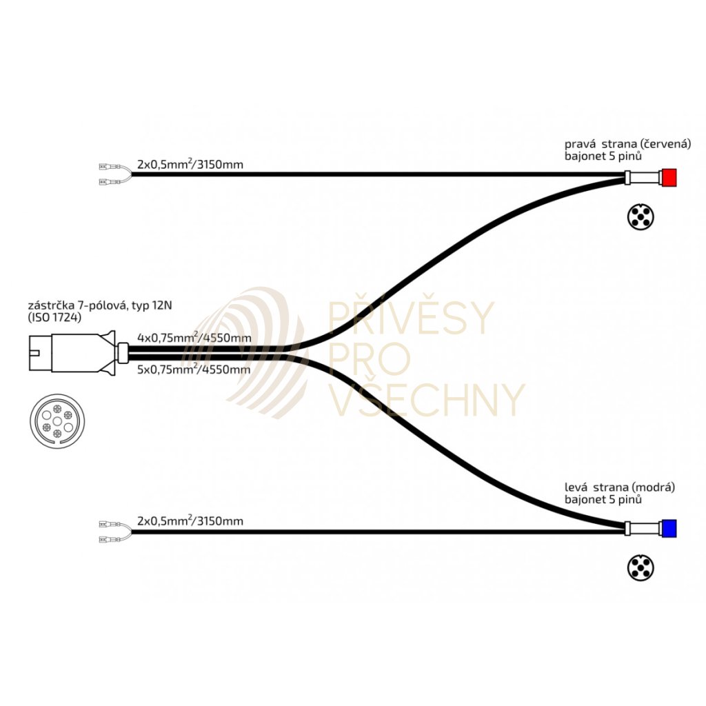 - Ze sedmipólové zástrčky jsou vyvedeny dvě větve kabelů 5x0,75 mm2 a 4x0,75 mm2 (levá a pravá) o délce 4550 mm.