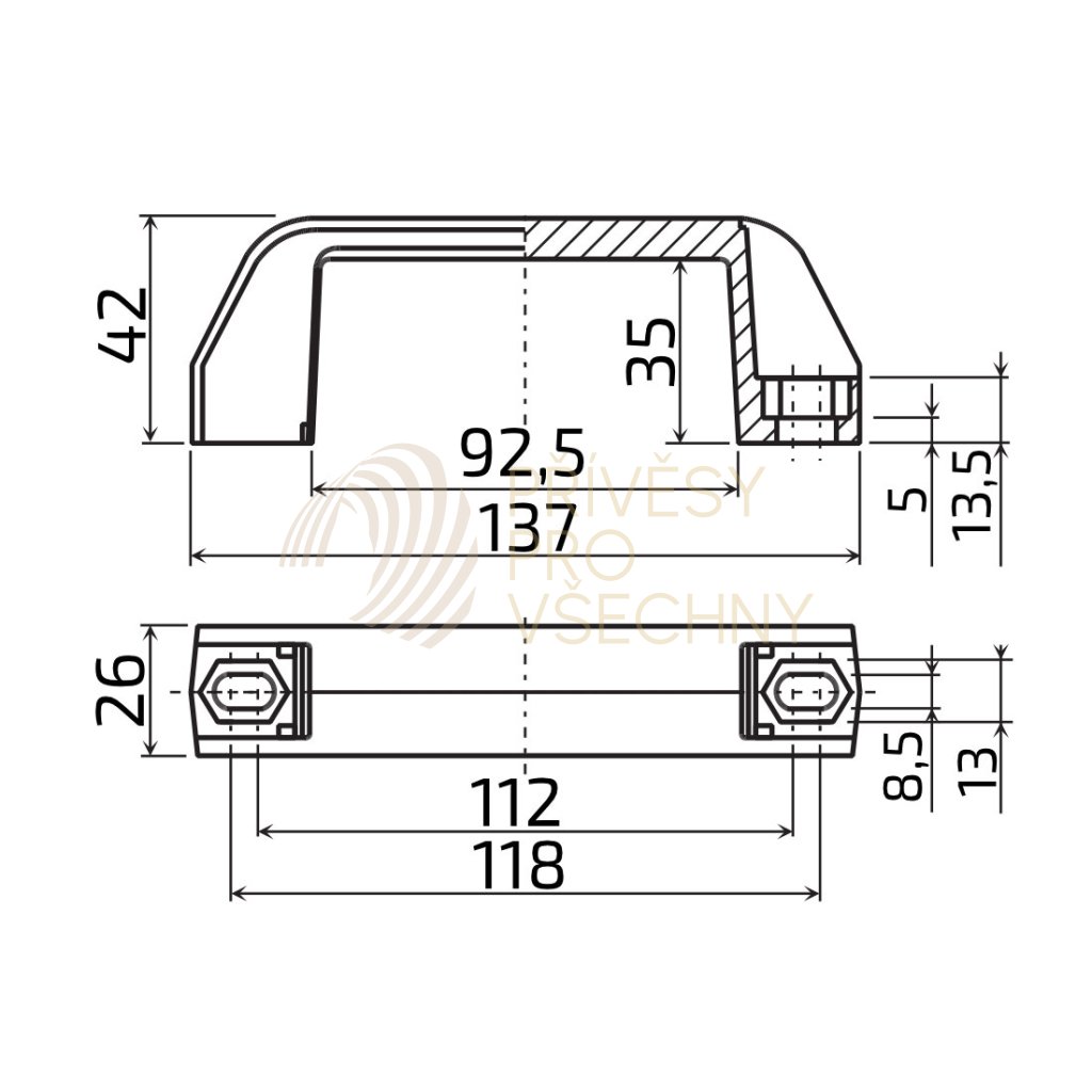 - Madlo je vybavené dvěma oválnými otvory pro šroub M8 s vnitřním prolisem pro vsazení běžné šestihranné hlavy/matice 13 mm.
