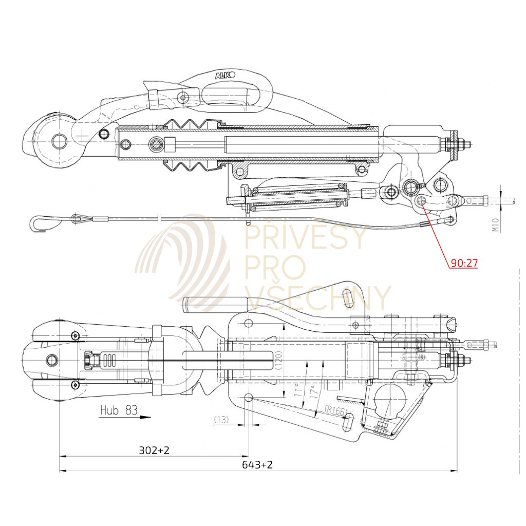 - UPOZORNĚNÍ: Převodový poměr přepákování nájezdové brzdy je nastaven napevno 90:27 (pro kolové jednotky AL-KO 1636G, 1637 a 2051) a nelze ho změnit pro jiné kolové jednotky např. 2361. Pro větší kolové jednotky je nutné objednat provedení brzdy s poměrem přepákování 90:30 nebo 90:33,5.