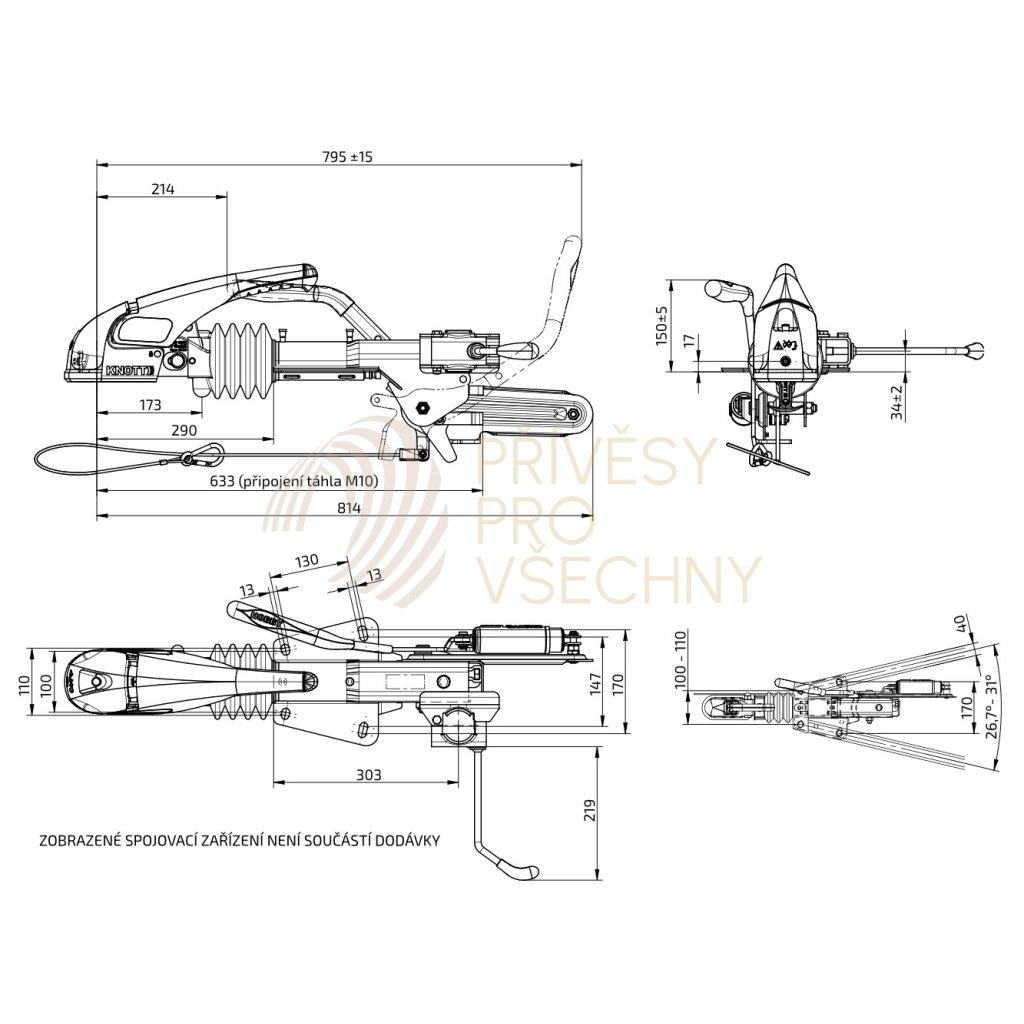 Nájezdová brzda KNOTT KFL 12 Ausf. B s navařenou konzolou s držákem opěrného kolečka pr. 48 mm. Brzda je dodávaná bez spojovacího zařízení (tažná kulová spojka, tažné oko, stabilizační spojka). Montovat lze odpovídajícíc spojovací zařízení vhodné pro průměr trubky 45 mm k uchycení šrouby M12 do kříže. Při výměně je vyžadována odborná montáž s seřízení/nastavení brzdového systému.Doplňkové parametry
