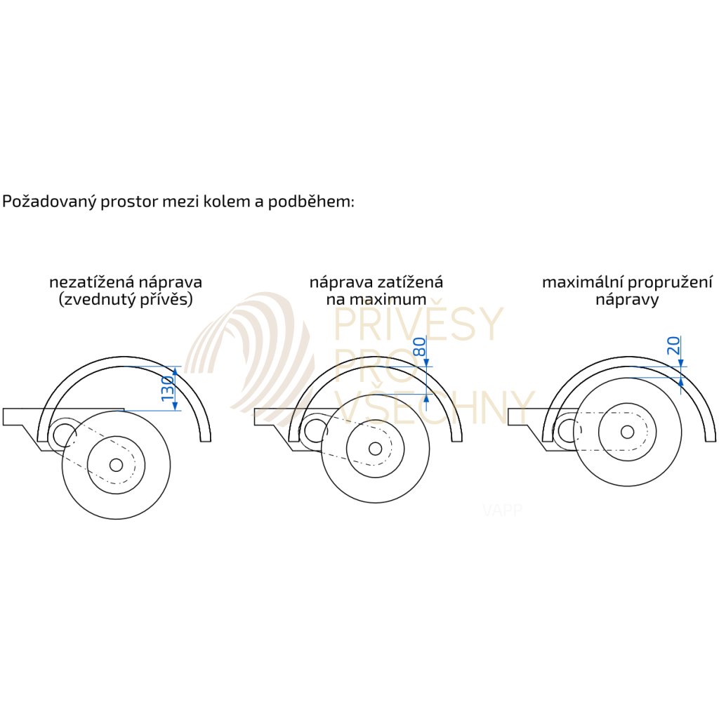 - Náprava je osazená kolovými brzdovými jednotkami AL-KO s couvací automatikou. Při couvání, kdy tlakem tažného automobilu dojde k aktivaci brzd, dokáže mechanismus kolové jednotky rozlišit směr otáčení kola vzad a brzdy uvolnit.