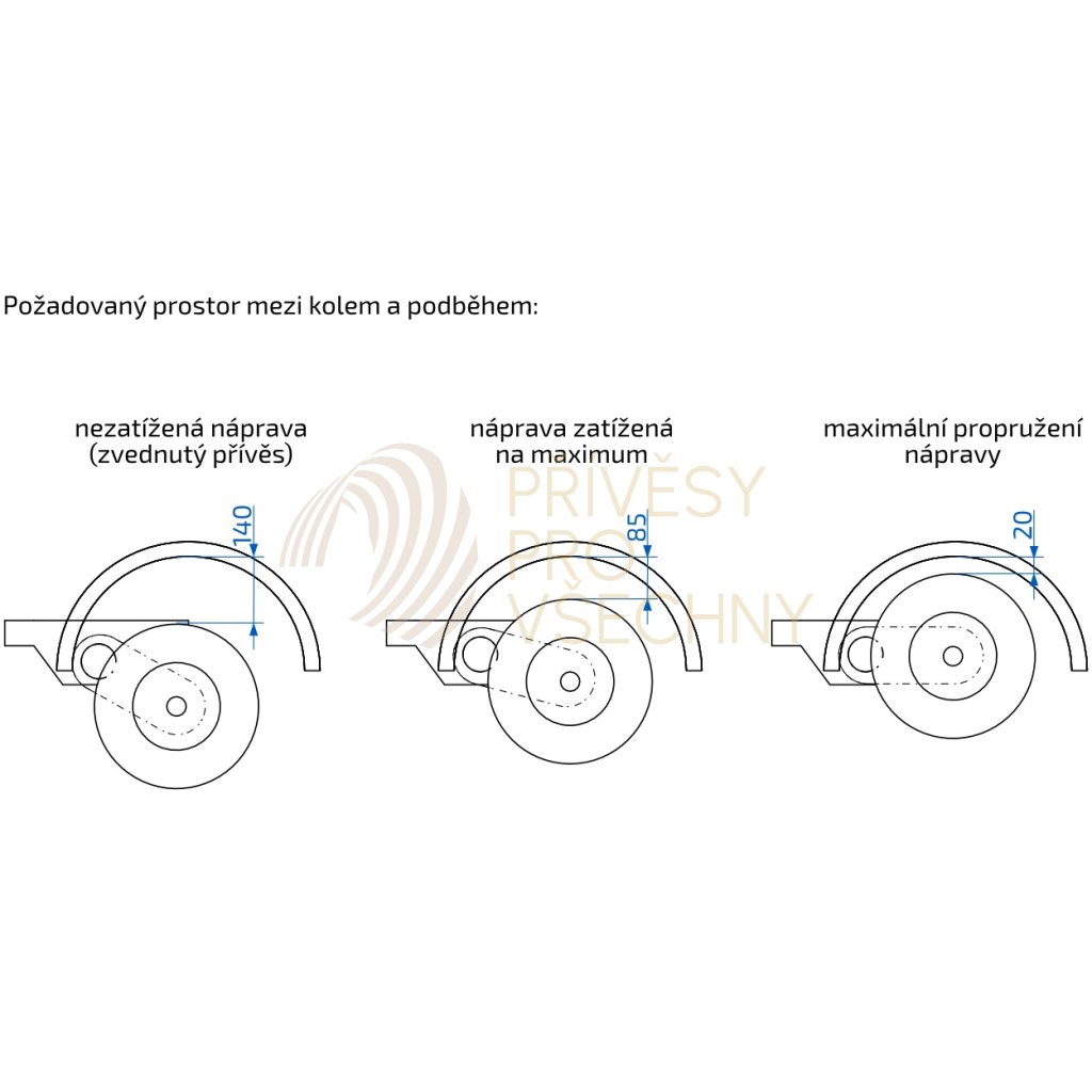 - Náprava je osazená kolovými brzdovými jednotkami AL-KO s couvací automatikou. Při couvání, kdy tlakem tažného automobilu dojde k aktivaci brzd, dokáže mechanismus kolové jednotky rozlišit směr otáčení kola vzad a brzdy uvolnit.