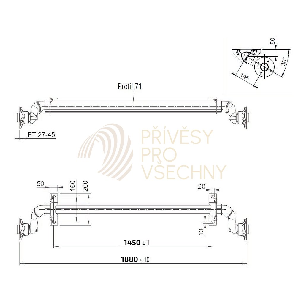 Náprava AL-KO UBR 700-5 (750 kg) a=1450 mm, c=1880 mm, 100x4, patky 50