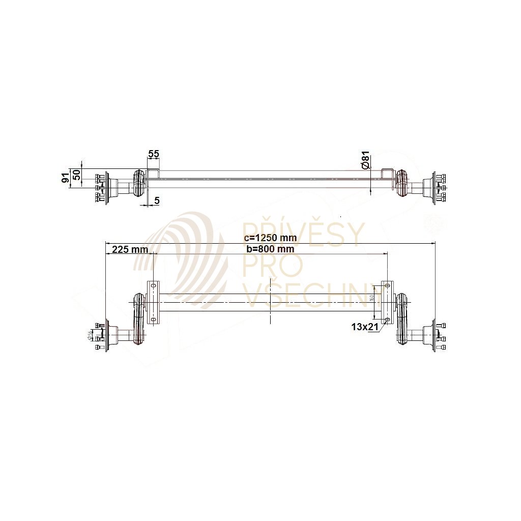 Náprava KNOTT G 13 (1300 kg) b= 800 mm, c=1250 mm, 100x4, patky 50