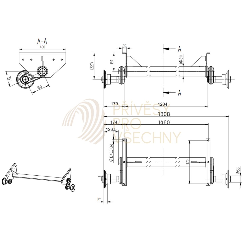 Náprava KNOTT G 13 (1300 kg) b=1460 mm, c=1808 mm, 100x4, patky 159, Sacher