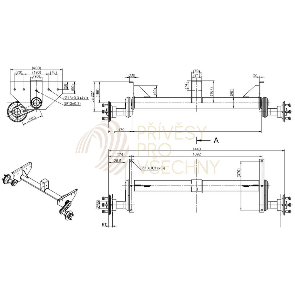 Náprava KNOTT G 13 (1350 kg) b=1092 mm, c=1440 mm, 100x4, patky 159, NP,DV