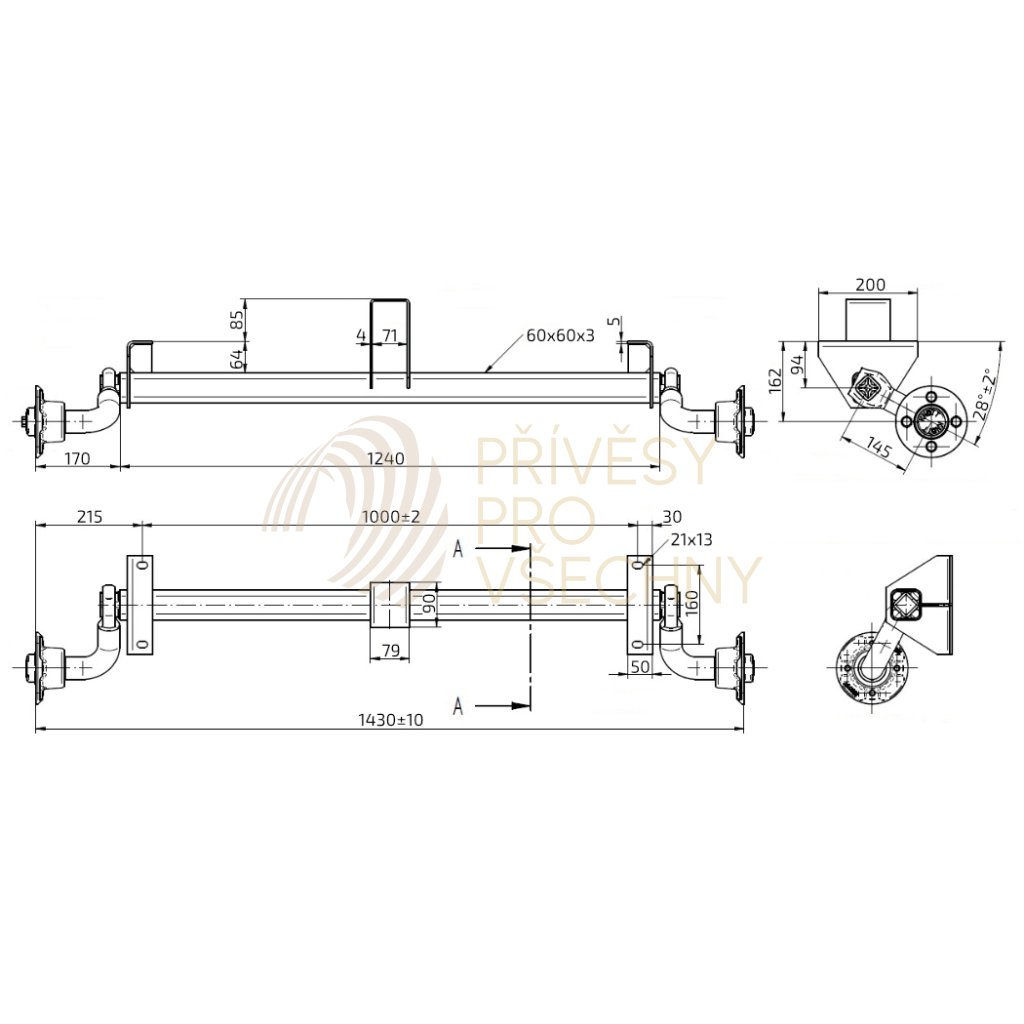 Náprava KNOTT VG 7 (750 kg) b=1000 mm, c=1430 mm, 100x4, stř. opěra (Handy 1,2,3,13,15,20)