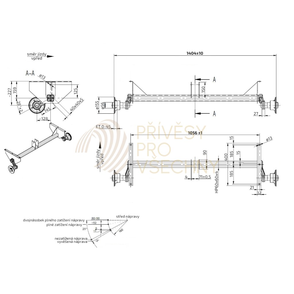 Náprava KNOTT VG 7 (750 kg) b=1056 mm, c=1404 mm, 100x4, patky 159, stř. opěra, Sacher