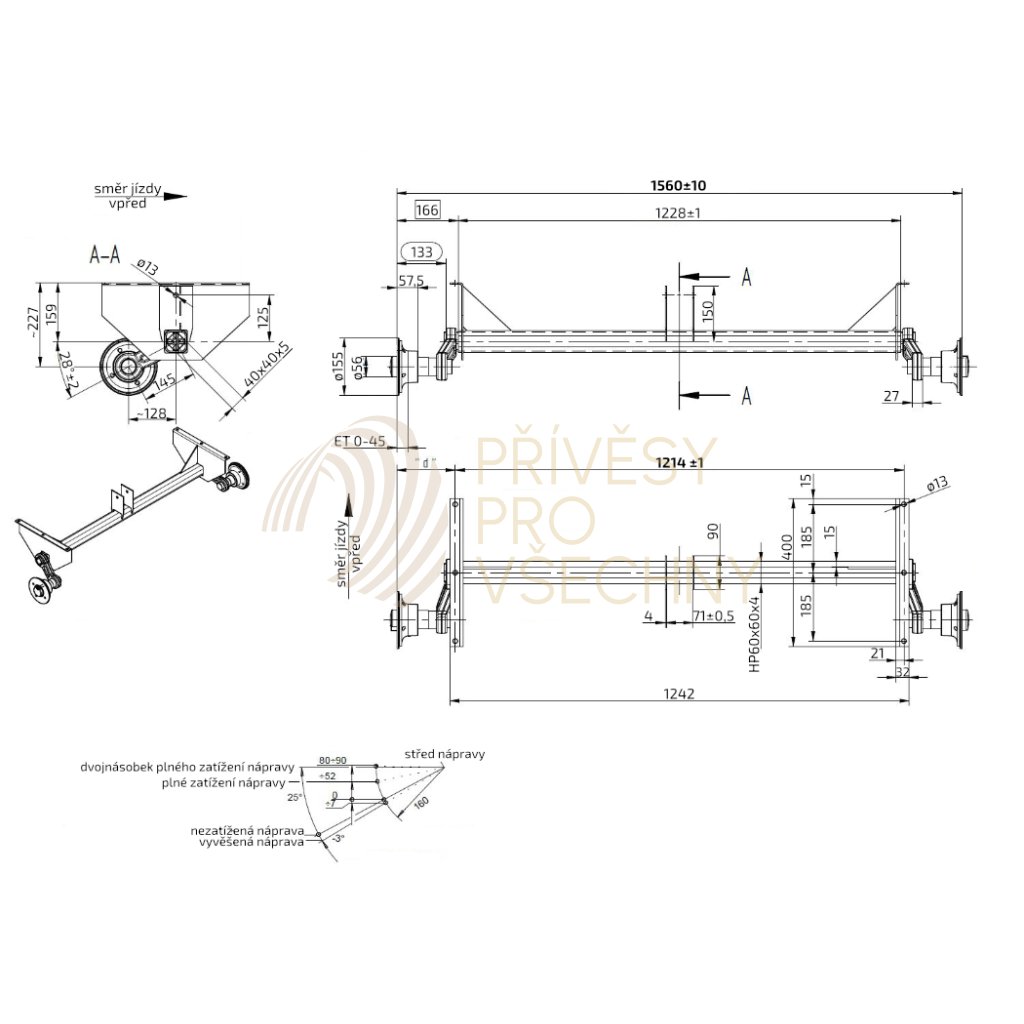 Náprava KNOTT VG 7-L b=1214mm ve starším provedení s rozměrem c=1560mm. Pozor: existuje i nové provedení s rozměrem c=1530mm, toto nové provedení lze objednat zde.