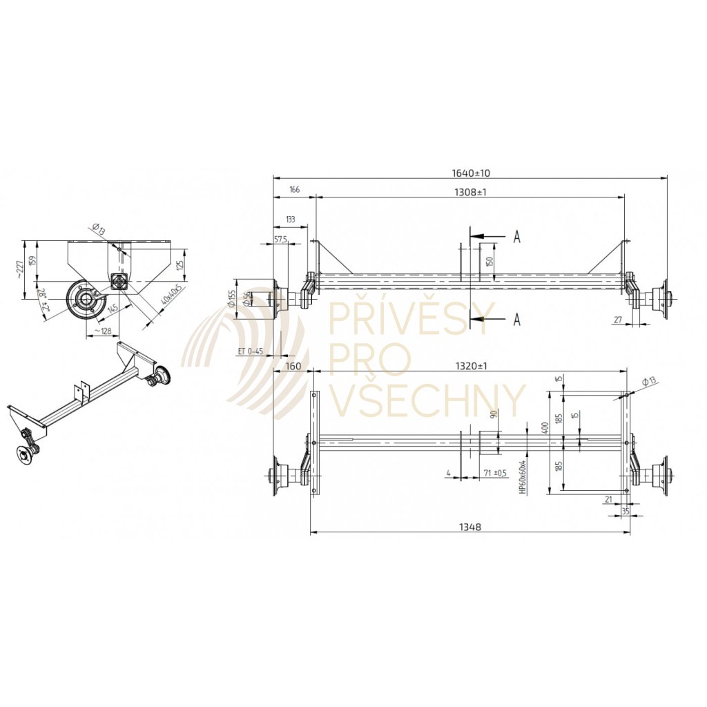 Náprava KNOTT VG 7 (750 kg) b=1320 mm, c=1640 mm, 100x4, patky 159, stř. opěra, Sacher