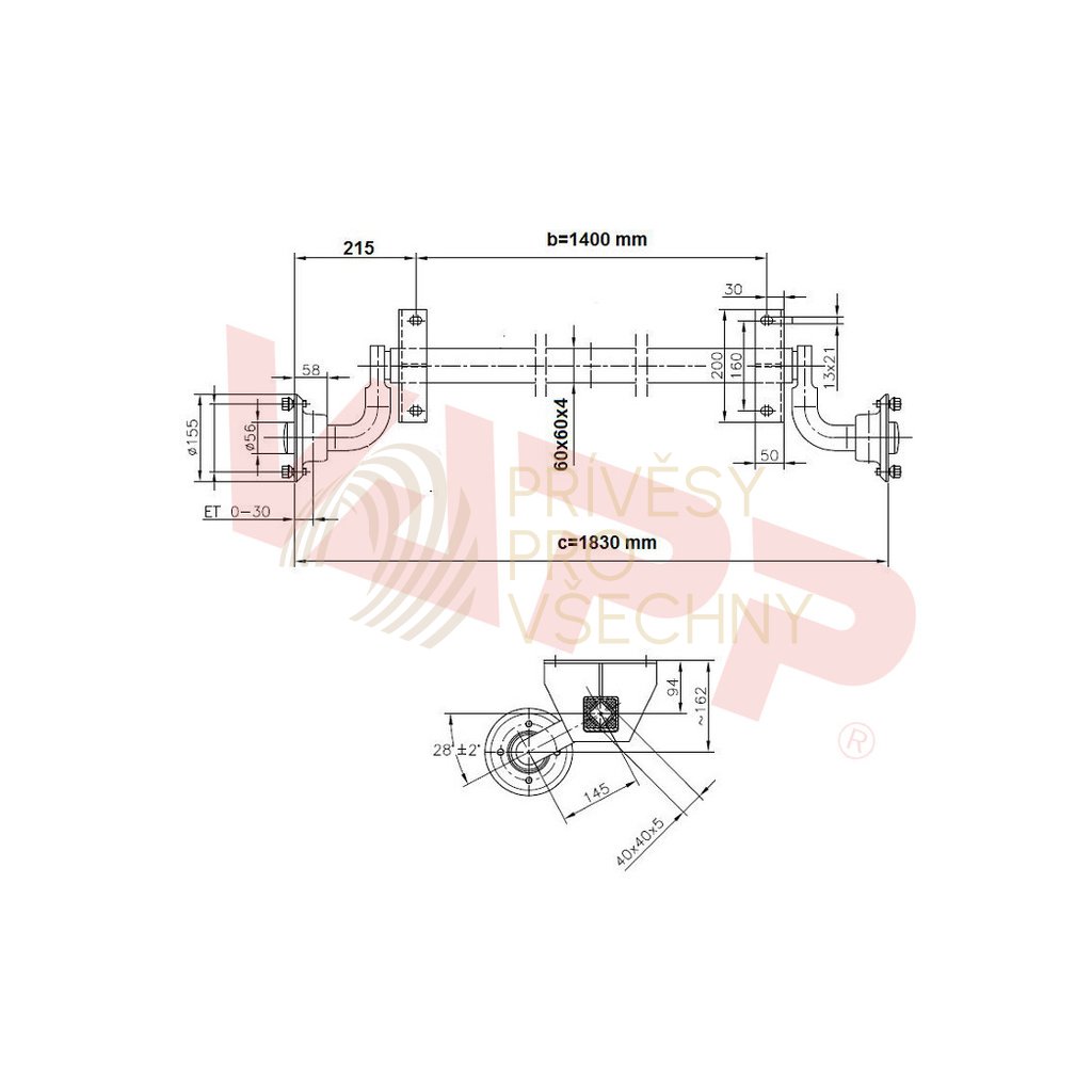 Náprava KNOTT VG 7 (750 kg) b=1400 mm, c=1830 mm, 100x4, patky 94 (PV 0.7)