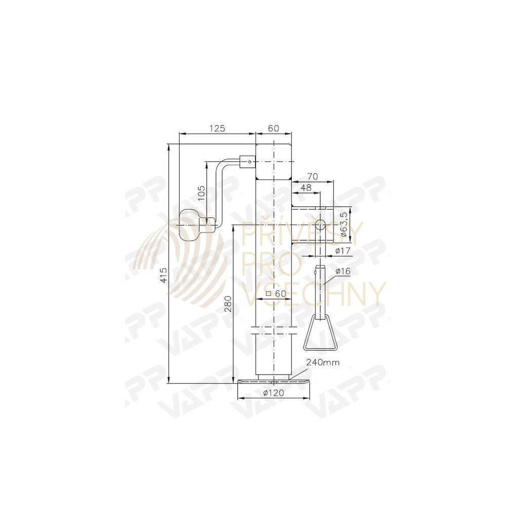 Opěrná noha je opatřena klikou. Otáčením kliky lze vysunout spodní část nohy až o 240 mm.