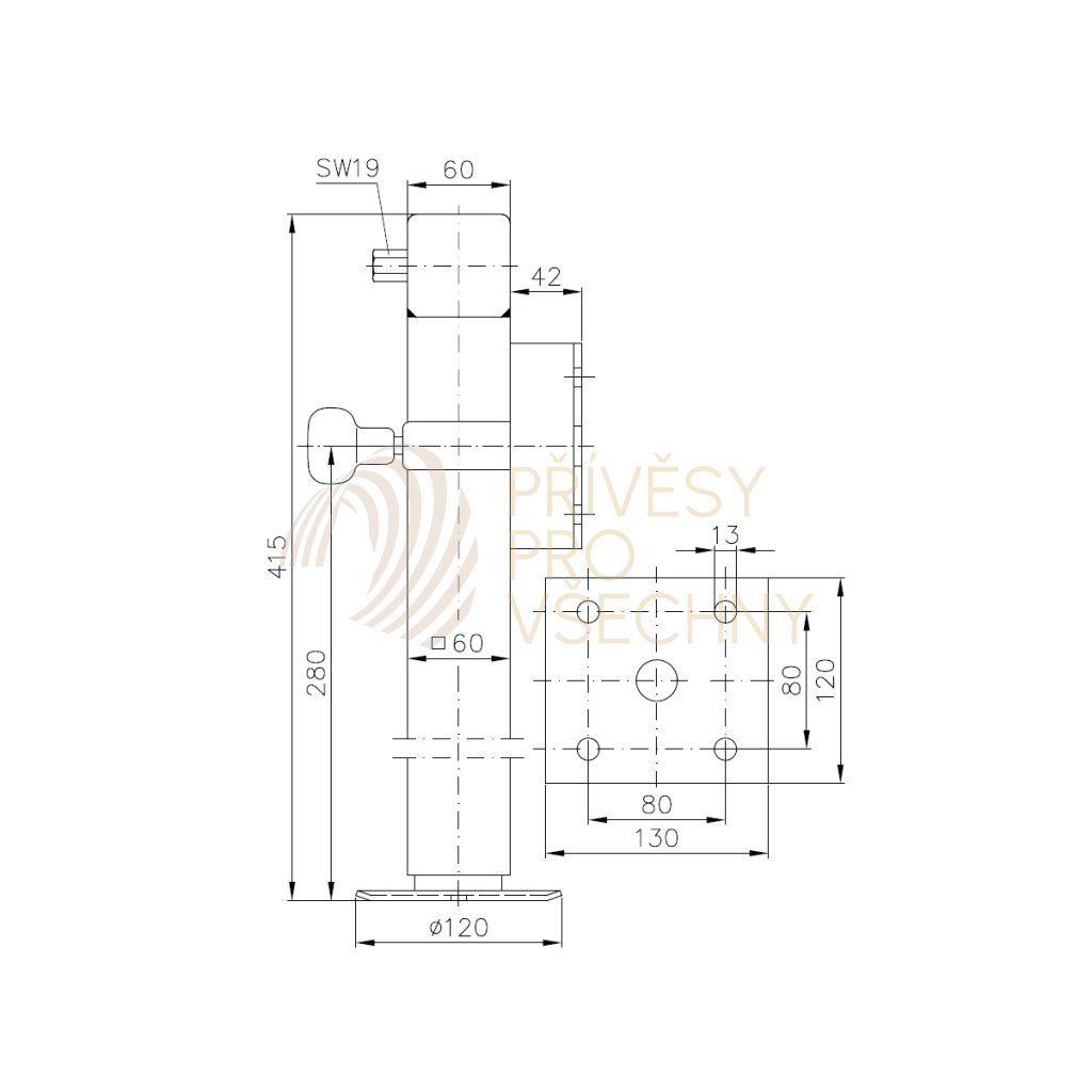 Opěrná noha je opatřena 19 mm šestihranem. Otáčením šestihranu lze vysunout spodní část nohy až o 240 mm.
