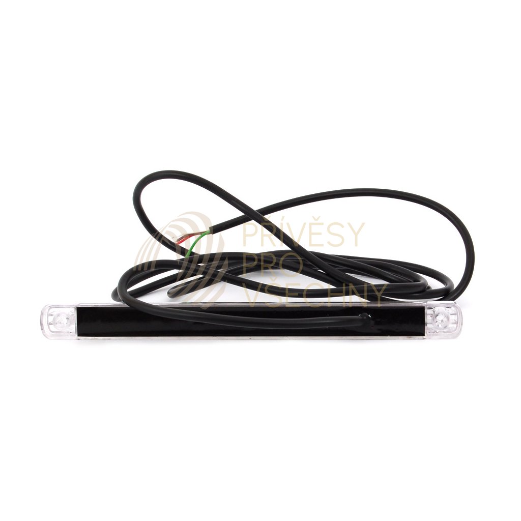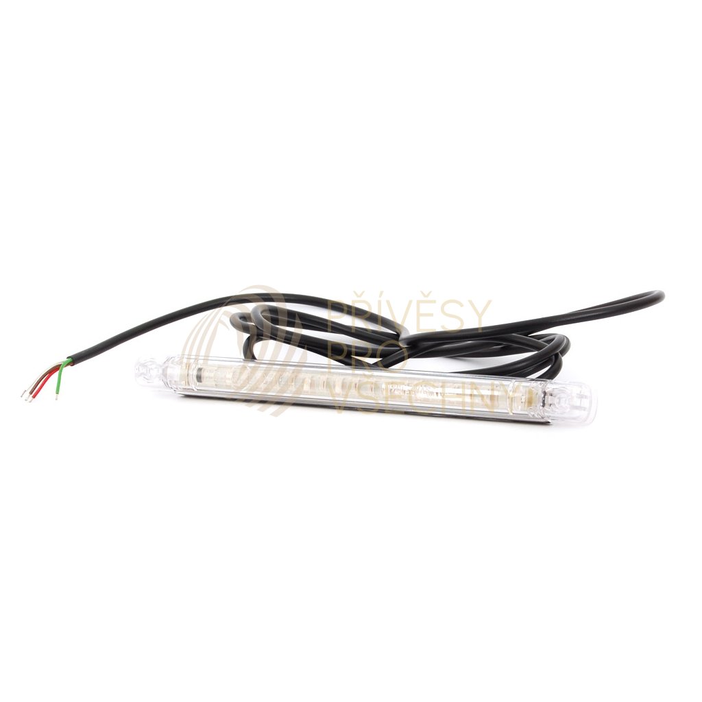Multivoltážní zadní sdružená svítilna 12V až 24V v LED provedení a moderním designu z čirého plastu s funkcemi směrové svítilny (oranžová barva), zadní koncová svítilna (červená) a brzdové světlo (intenzivní červená).