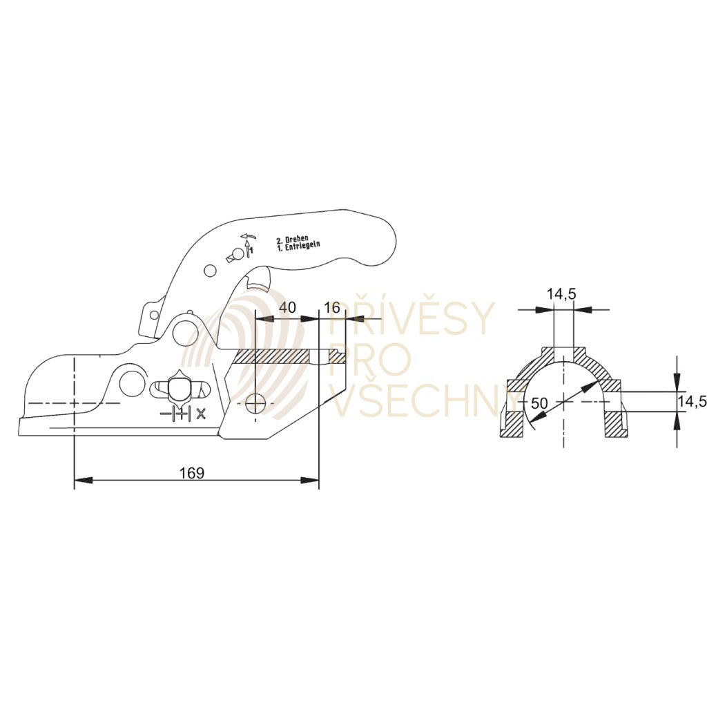 Tažná spojka pro nájezdové brzdy KNOTT s tažnou trubkou o průměru 50 mm do maximální hmotnosti přívěsu 2700kg. Rozteč montážních otvorů je 40 mm.