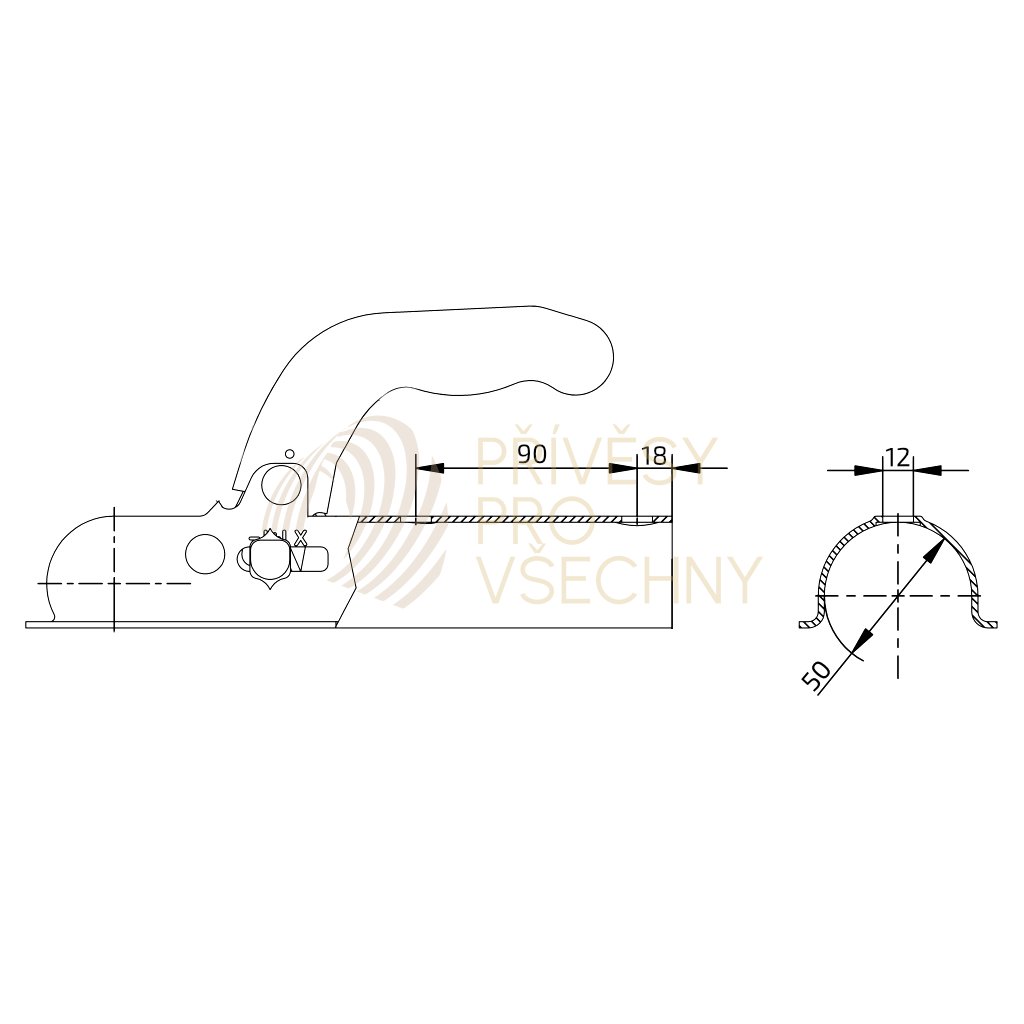 Rozteč montážních otvorů je 90 mm. Tažná kulová spojka KNOTT pro nebrzděné přívěsy o maximální hmotnosti do 750 kg. Tažná kulová spojka je před nechtěným odpojením chráněna speciální pojistkou.