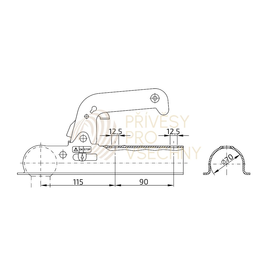 Tažná spojka 800 kg na trubkovou oj průměr 70 mm, vhodná pro nebrzděné přívěsy.Doplňkové parametry