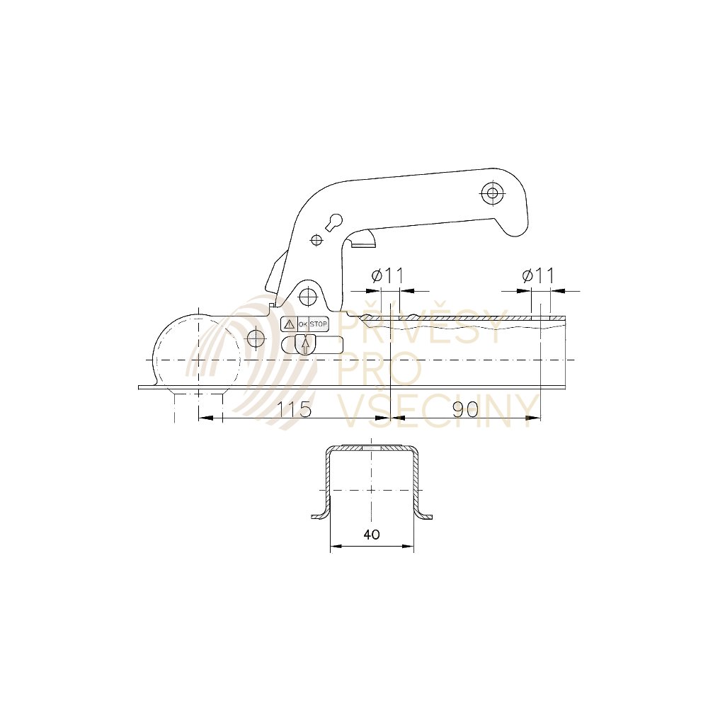 Tažná spojka pro přívěsy s maximální celkovou hmotností 800 kg. Montuje se na čtyřhrannou oj 40x40 mm. Je vybavena ukazatelem míry opotřebení a odpojovací pojistkou. V ceně tažné spojky je držák sedmipólové zástrčky elektroinstalace. Maximální svislé zatížení 75 kg, galvanicky pozinkováno.Doplňkové parametry