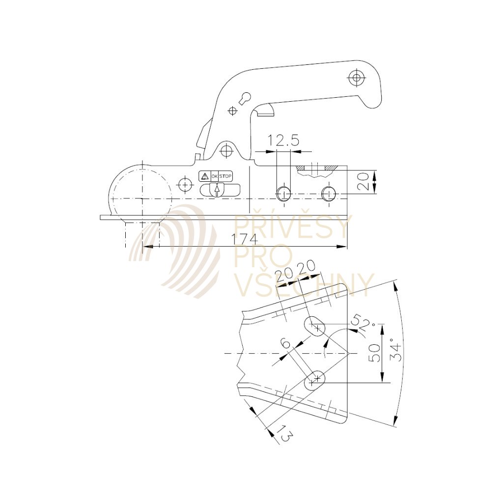 Tažná spojka je po dobu své životnosti samoseřizovací. O míře opotřebení tažné spojky, resp. tažné koule informuje indikátor na boční straně spojky. Ovládací madlo je osazené stiskací pojistkou a otvorem pro vložení zámku WW 8 (zámek není součástí dodávky - najdete ho v doporučených produktech níže na stránce).
