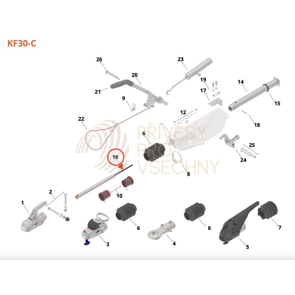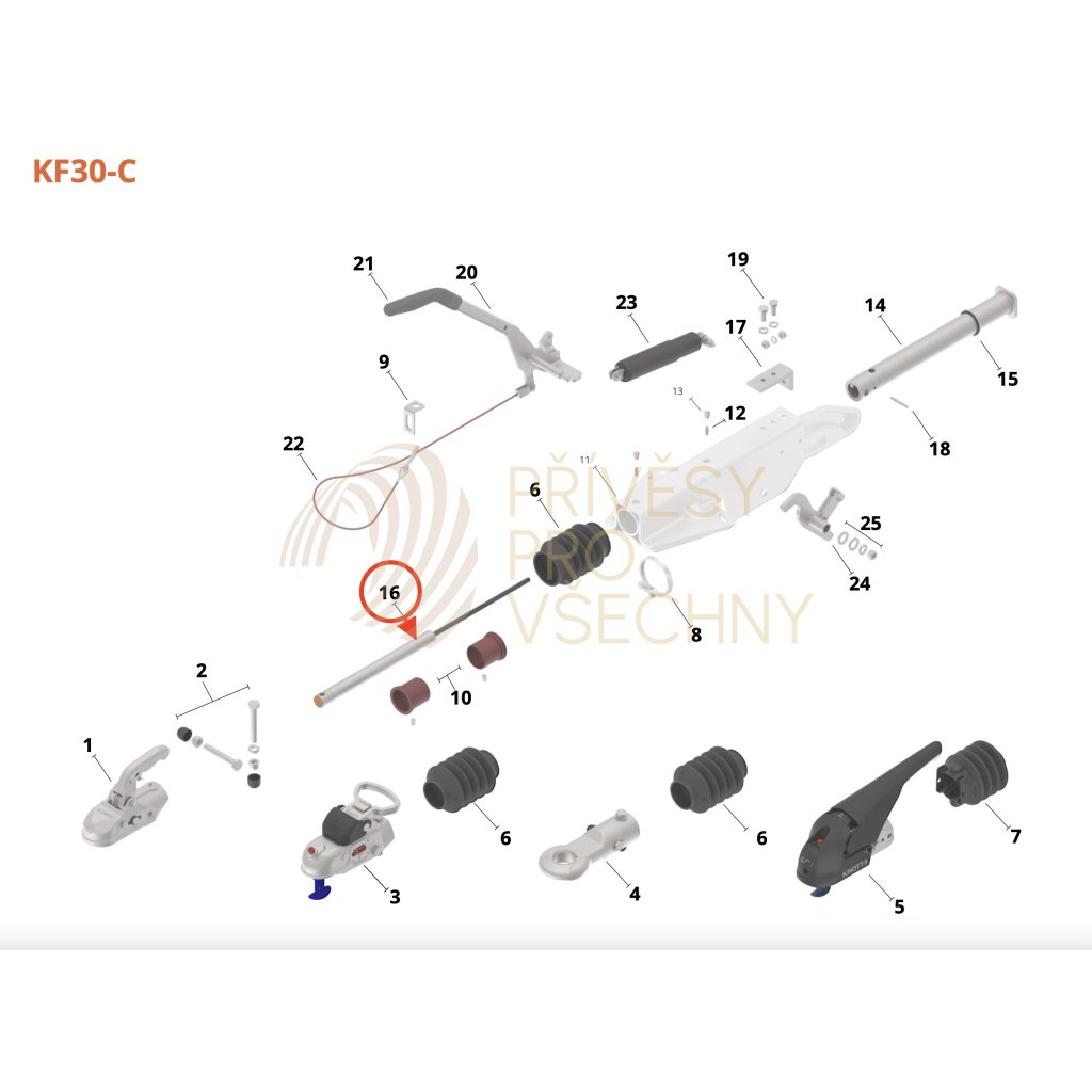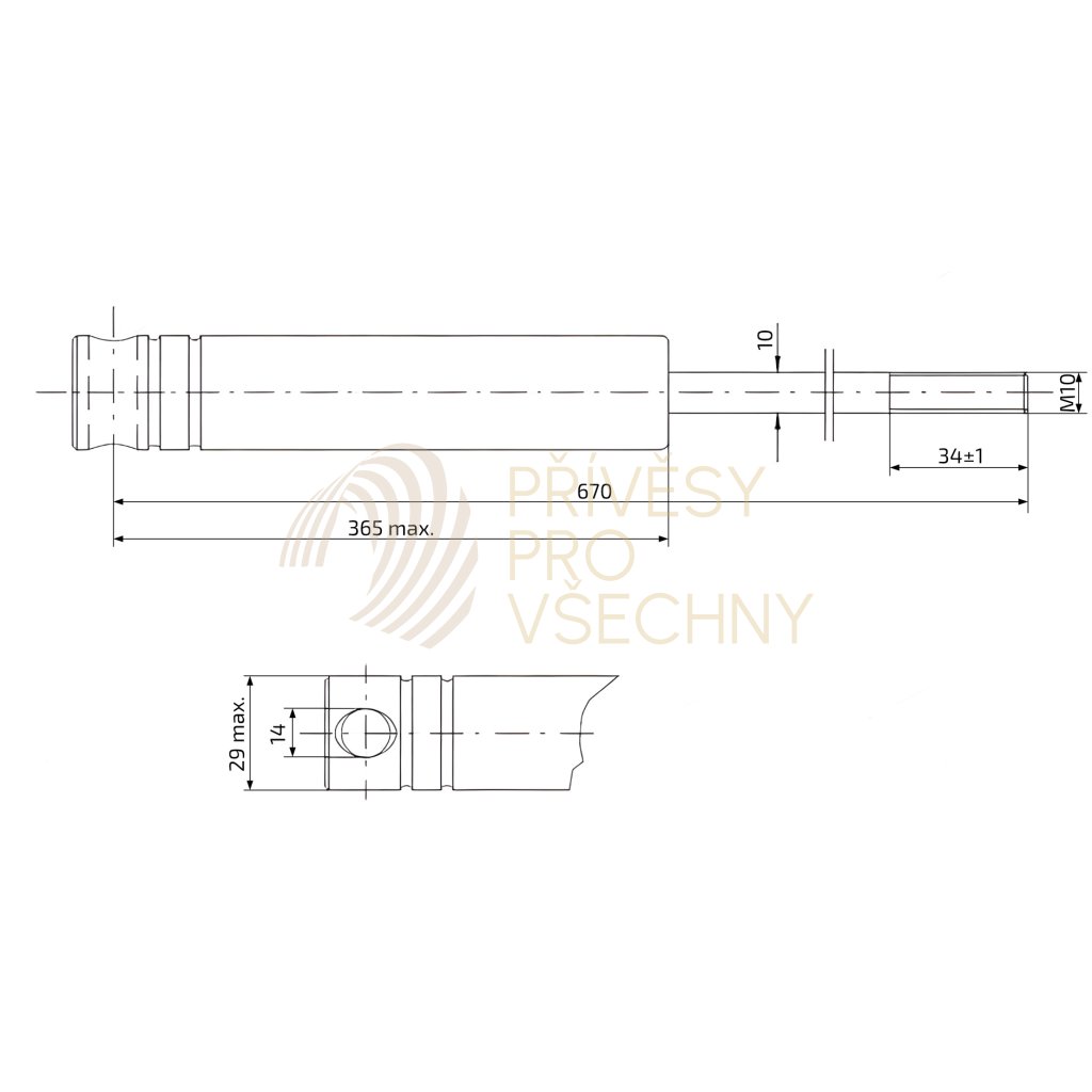 Tlumič nájezdové brzdy KNOTT KF 30 Ausf. C (pro nejvyšší povolenou hmotnost přívěsu 3000 kg). Délka tlumiče 670 mm (střed oka - konez závitu M10). Dvojčinný plynokapalinový tlumič je uložený v tažné trubve nájezdové brzdy. Zajišťuje plynulý náběh brzdné síly a plynulé odbrzdění přívěsu. Opotřebený nebo poškozený tlumič se projevuje výraznými rázy přívěsu při brzdění nebo při rozjezdu.Doplňkové parametry