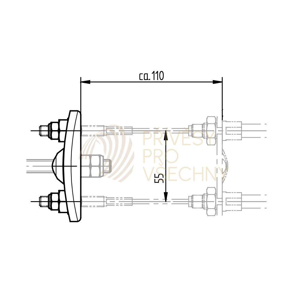 - Speciálním tvarováním v kombinaci s kulovými maticemi nebo rychlomontážními koncovkami lana je umožněn výkyv vahadla v širokém úhlu pro dorovnávání brzdného účinku pravého a levého kola přívěsu.