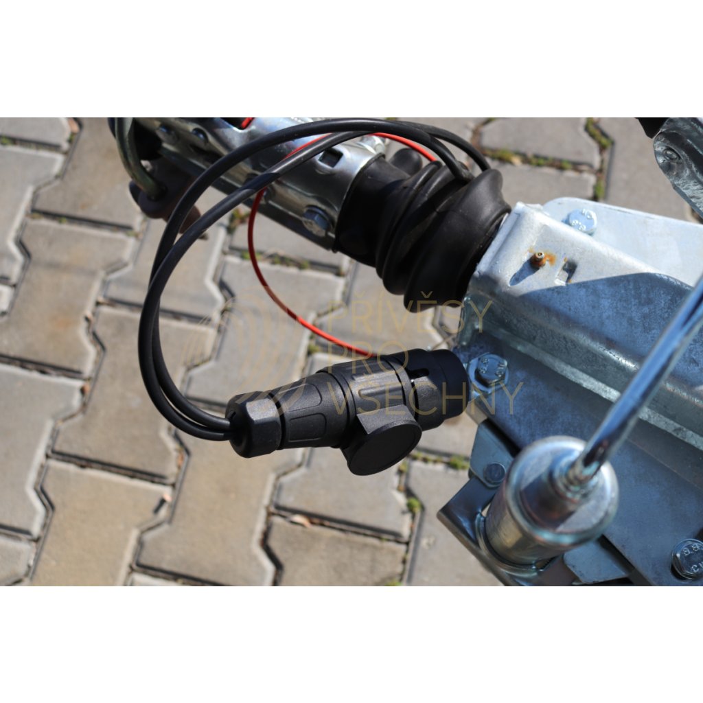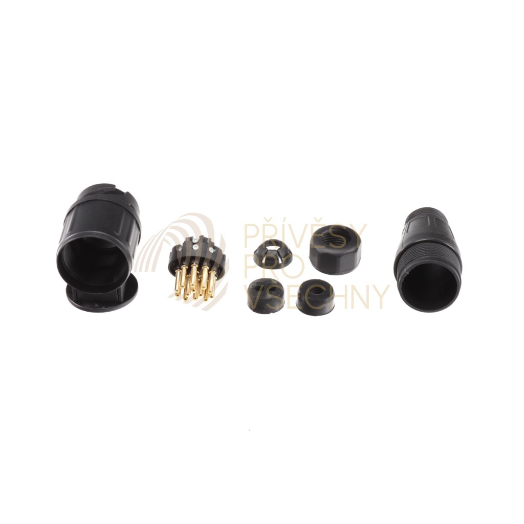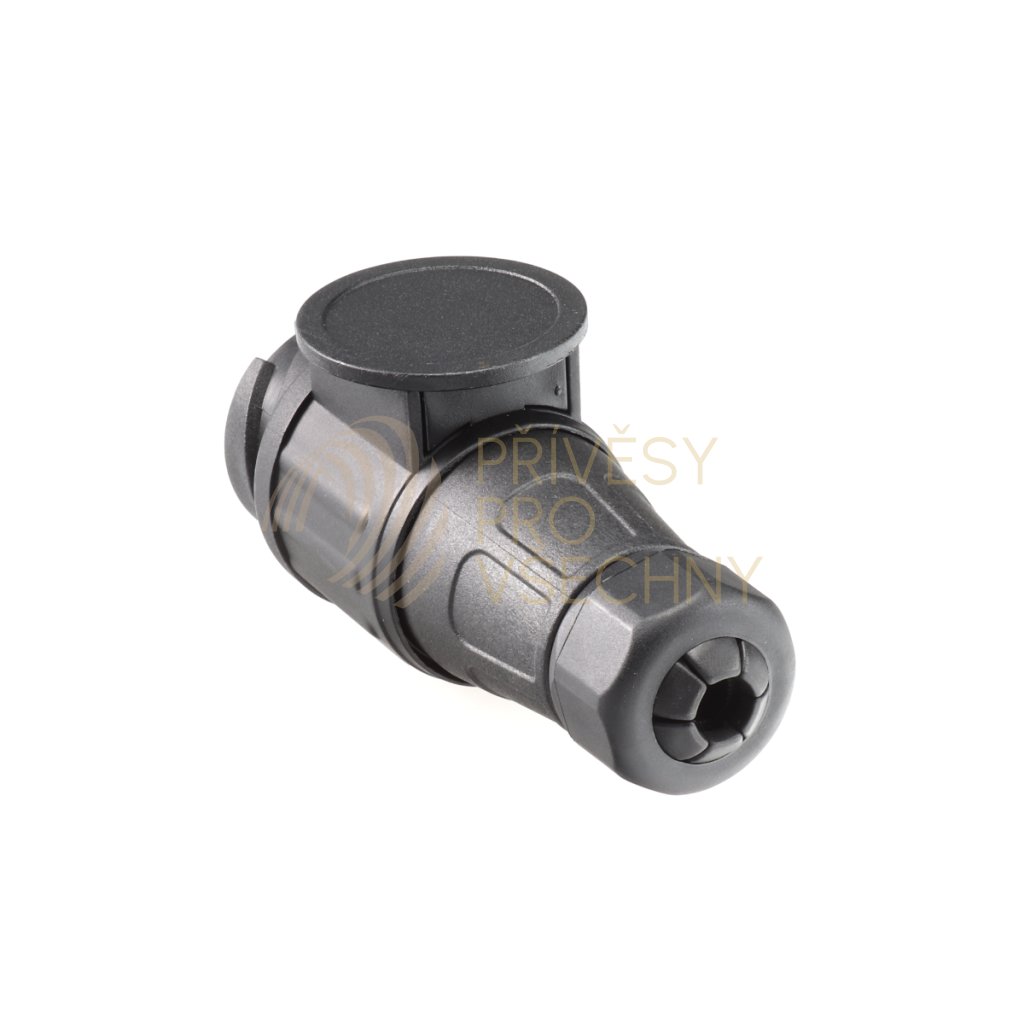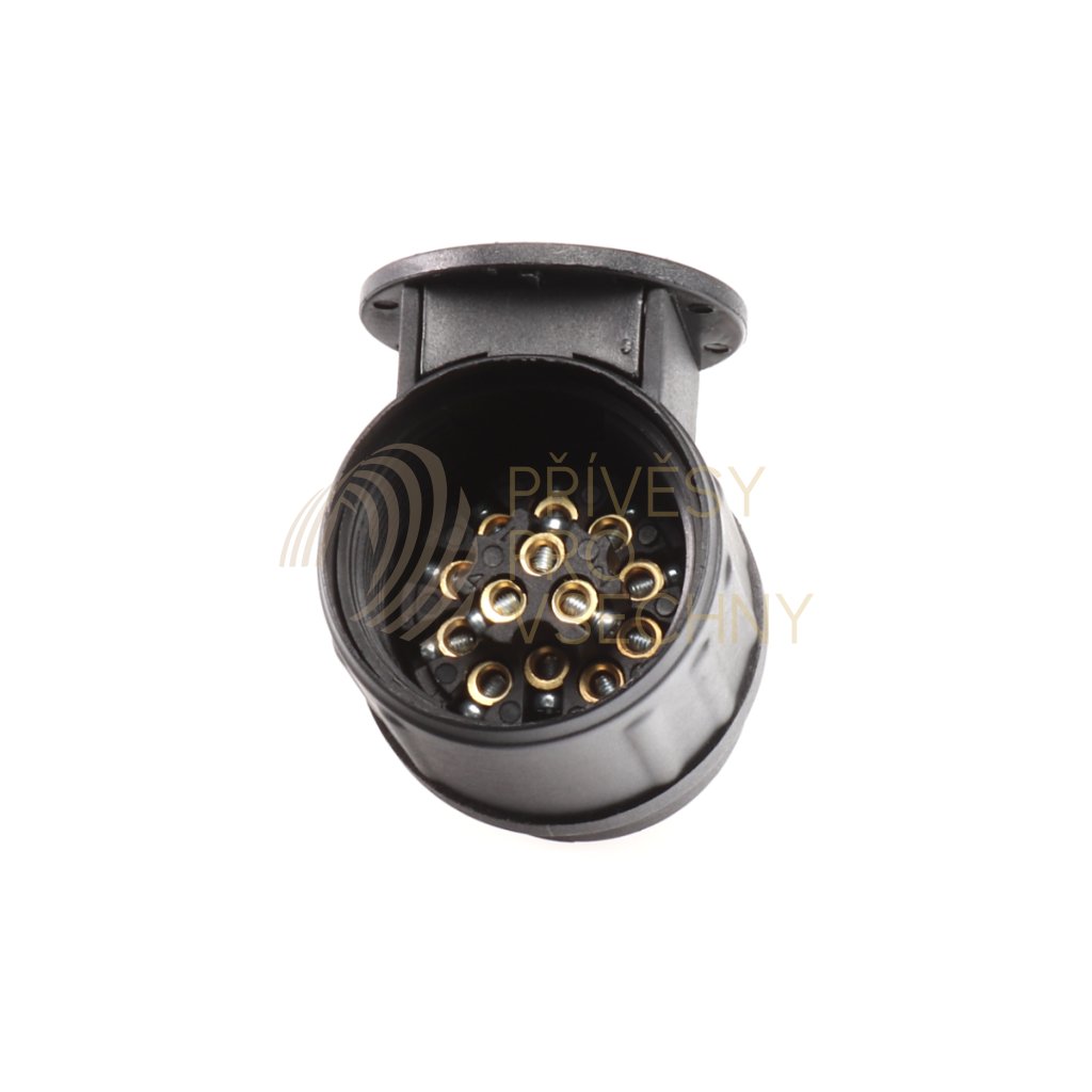 Zástrčka 13-pólová dle ISO 11446. Dodáváno se dvěma gumovými průchodkami (s vývodem pro jeden kabel, nebo s vývody pro dva kabely). Lze použít na elektroinstalace většiny přívěsů. Jednotlivé vodiče se k pinům připojují pomocí šroubků.